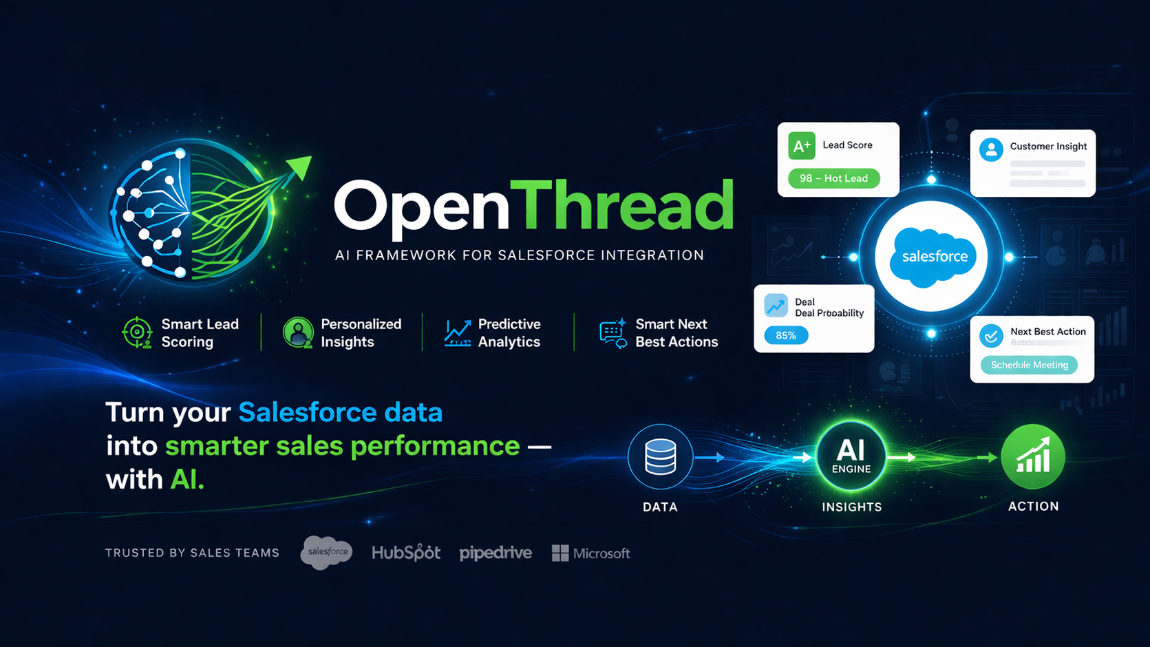 An AI framework that integrates seamlessly with existing sales platforms such as Salesforce and analyzes real-time data to make sales processes smarter. The framework supports teams with automated lead scoring, personalized customer insights, predictive analytics, and smart follow-up suggestions. This enables sales professionals to make better decisions faster, work more efficiently, and create more value from customer relationships.