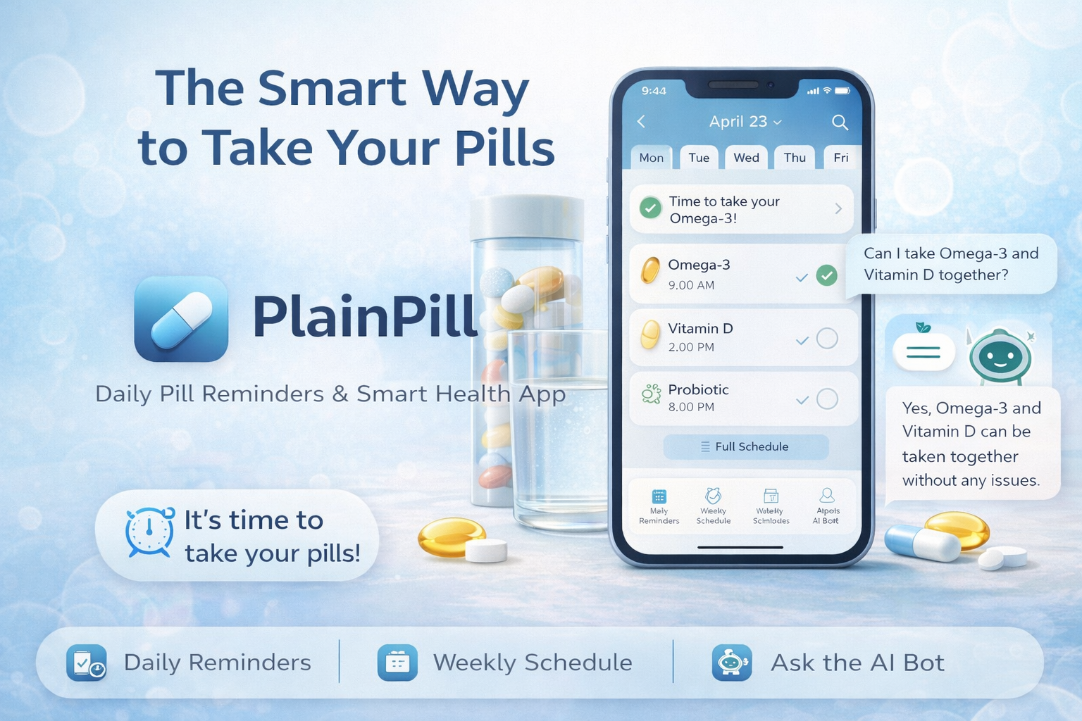 At PlainPill, our mission is to make correct medication use effortless and accessible to anyone with a smartphone. We believe that the problem isn't that people don't care about their health — it's that the information they need is buried in tiny-print leaflets, written in clinical language, and impossible to remember on a busy day. That's why we built PlainPill around one principle: **no reading required.** Instead of walls of text, we give you emoji-based guidance — clear, instant, universally understood: ☀️ Take with food. 🚫☕ Avoid coffee. 💧 Drink plenty of water. No leaflet-digging, no confusion, no excuses. We want every person — regardless of age, language, or health literacy — to feel confident about what they're putting in their body, and to build the small, consistent habits that make a real difference to their health over time.